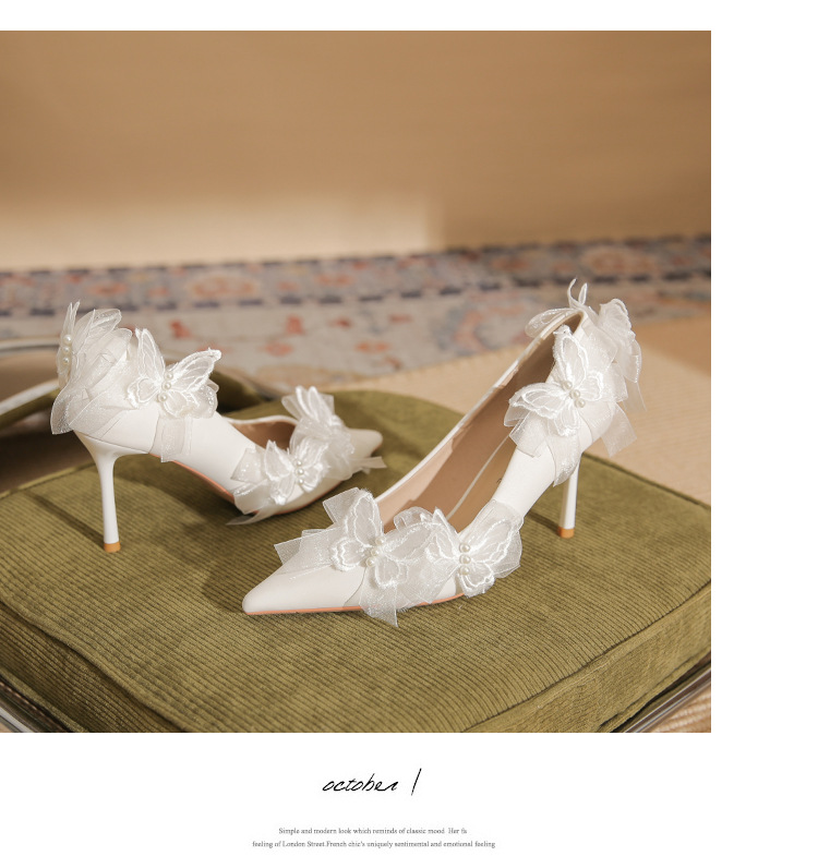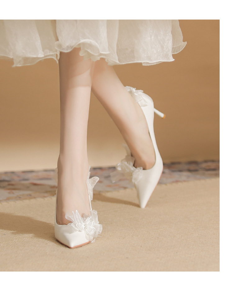 • High Heels For Women Stilettos 2024 New Style Pointed Toe Temperament White Lace Wedding Dress Bridal Shoes