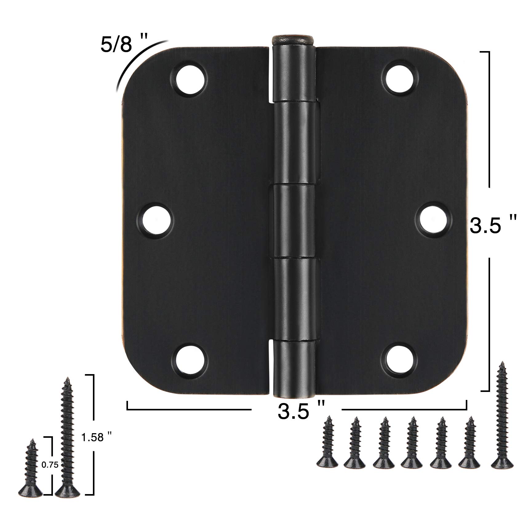 The door hinge is matte black 3.5" with 5/8 rounded corners and 6 holes for front doors, cabinets, wooden boxes. The Security Black Door Hinge 3.5" includes 180 free screws for quick and easy installation. The matte black door hinge can be rotated 270 degrees. The extra long screws are especially handy when replacing existing hardware with the same hole pattern. Product ReviewsRecently Viewed