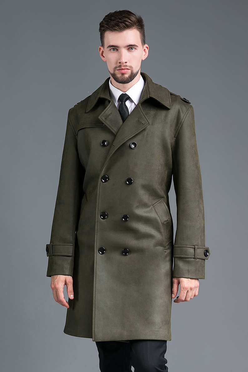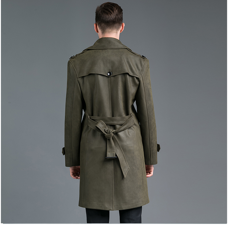 • Men's Deerskin Velvet Fashion Slim Double Breasted Mid-Length Trench Coat Army Green