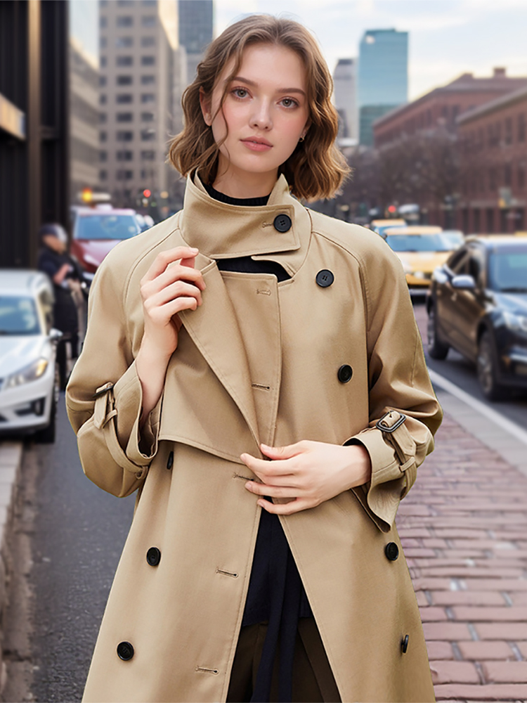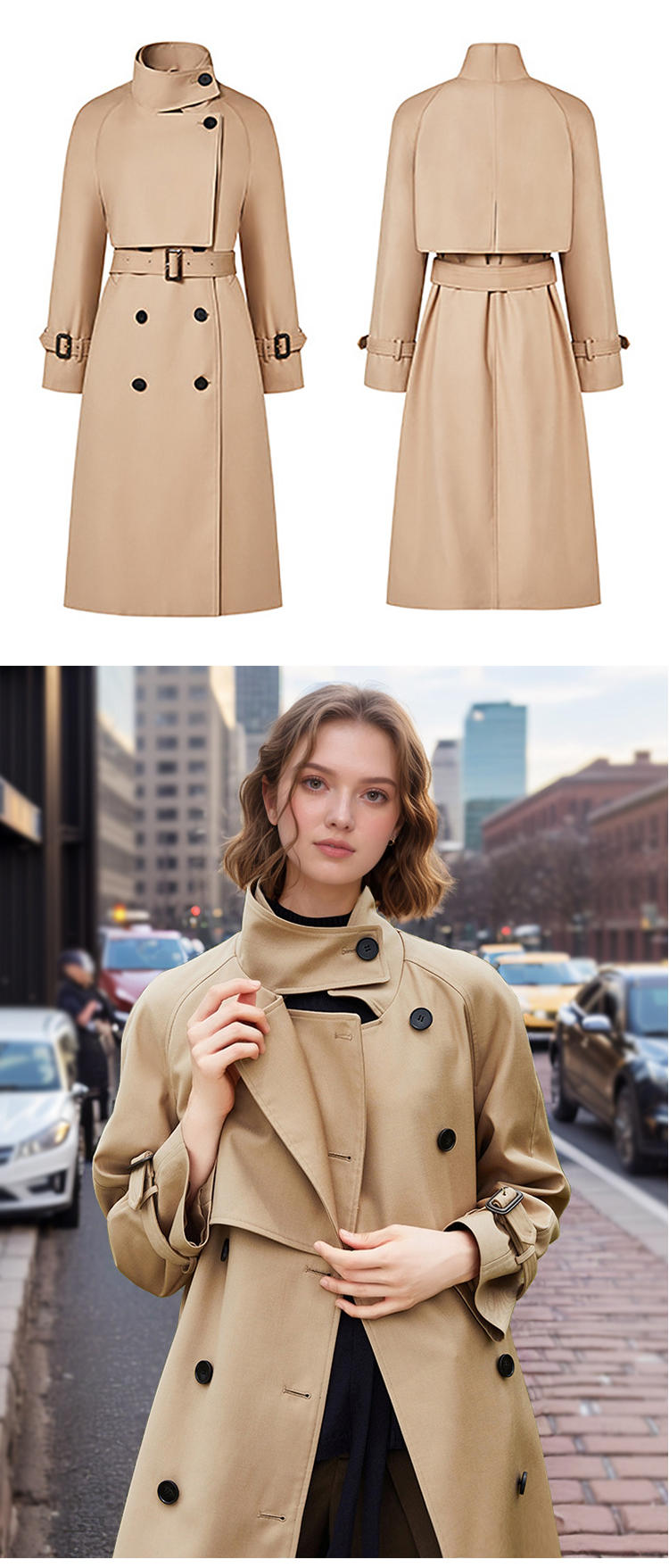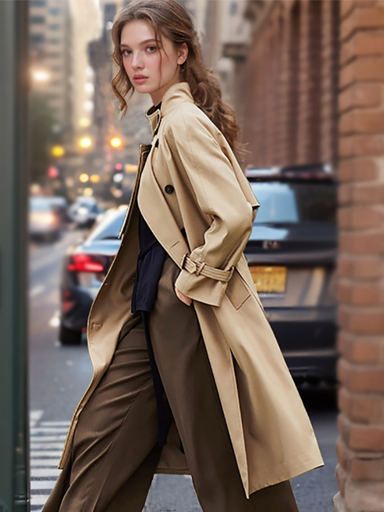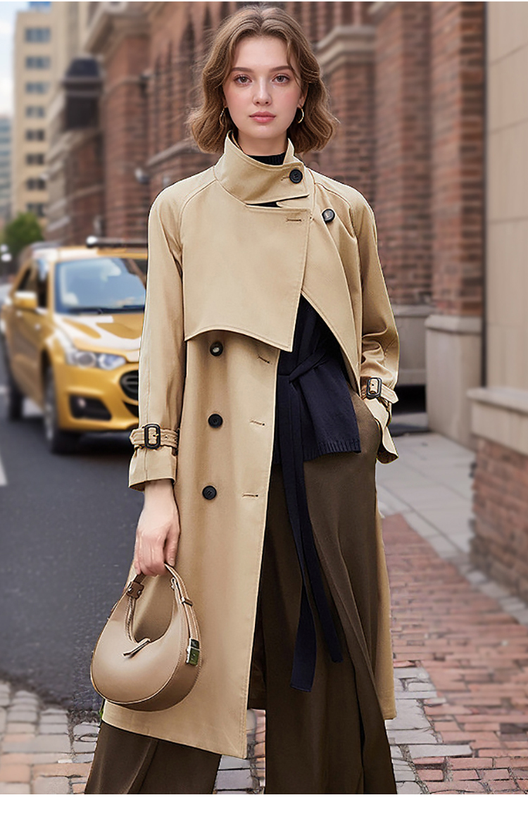 • 2024 Autumn New Lace-Up Stand Collar Mid-Length Female Thin Over Knee Trench Coat Khaki