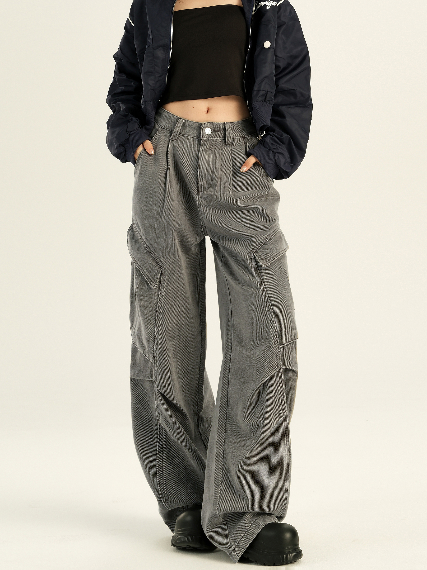 Women's Wide-Leg Cargo Jeans - Heavy-Duty American Style with Pocket Detail, Summer Loose Pants
