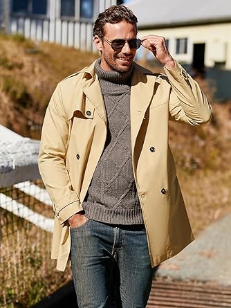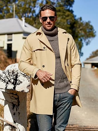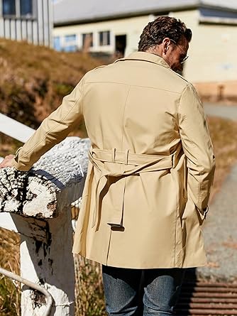 Men's Trench Coat Slim Fit Double Breasted Long Jacket Notched Lapel Belt Autumn Windbreaker Coat